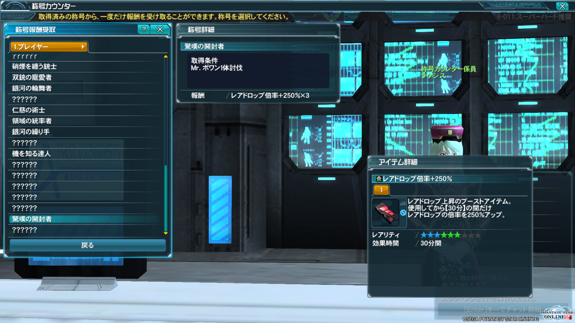 前回の記事で初めて出会ったMr.ボワンの称号でレアドロ250%x3が手に入った!